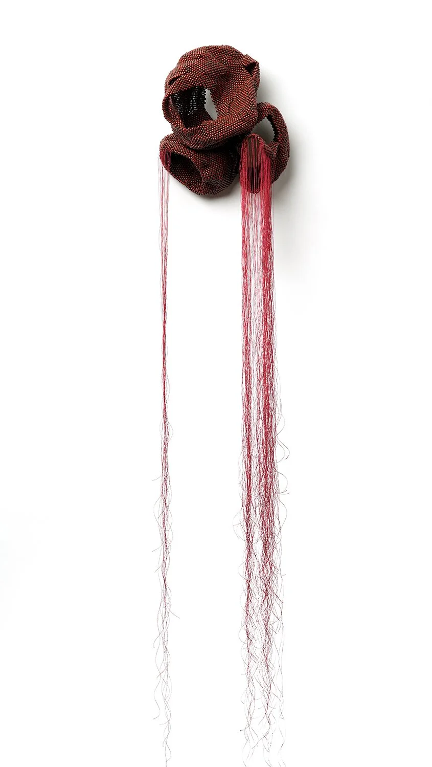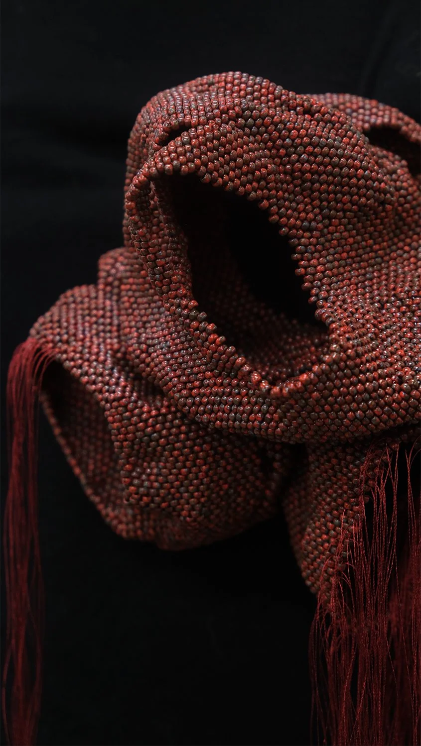 “...The oddity of randomness and the beauty of mathematical logic occurring in the same piece represents that I am using my work as an outlet to explore a random woman's adventure in this world. Textile and beading work throughout history have shackled women's lives but also contain women's magic. By using the tension of beads and thread, my practice calls back the memory of typical historical women's labor. But now women's traditional skills are my new weapon to fight patriarchy...”