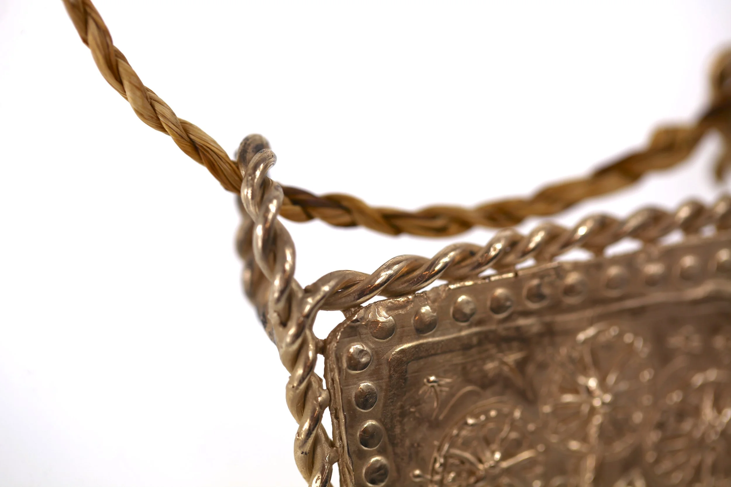 "The bronze medallion is hung from a foraged , hand-weaved, dandelion stem cord."