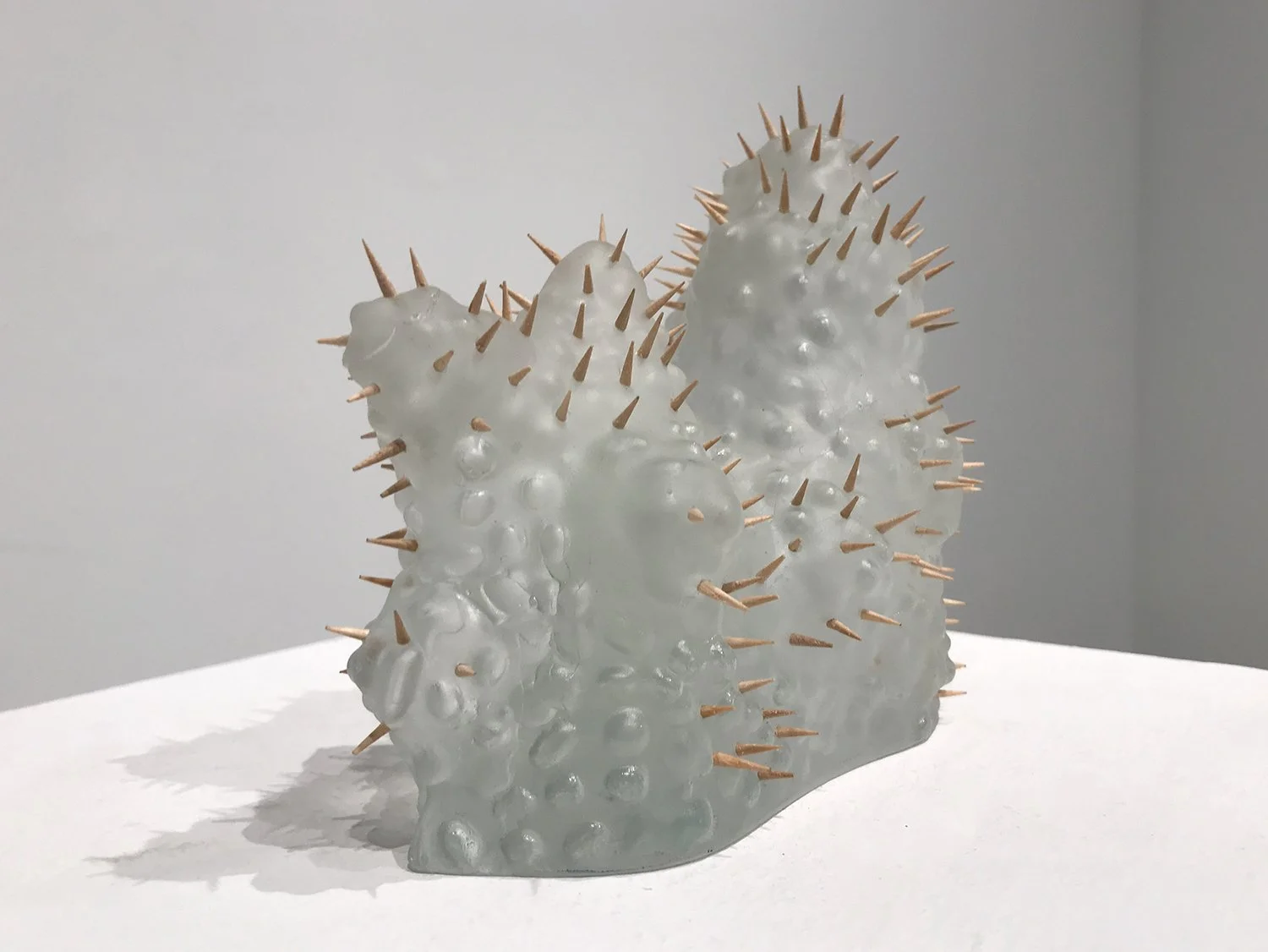 “Labor is a very important part of my practice and I and find repetitive, long form processes to be grounding. This casting is part of an in-process series exploring form and surface. The form was created as a type of automatic drawing. I sculpted a series of forms in clay, allowing my mind to wander while producing them. These forms were then cast in plaster, and waxes were pulled from these molds. The waxes each received different surface treatments, some given spikes, others dimples, and still others were given bumps. These waxes were then used to create plaster silica molds for glass casting. The glass form of this piece is hot casted, a process that requires a team of four or more glass workers. The communal nature of glass is what initially drew me to the material, and I generally prefer to hot cast as it engages the high energy of the hot shop. Following the demolding the casts are coldworked and polished. The surface of this casting was then drilled into to create a number of holes. These holes were then filled with spikes. The wooden spikes are toothpicks from a Diamond brand box of 800 toothpicks from 2005 that has faded to the most attractive shade of pink I have ever seen. The surface treatments this piece received both as a wax positive and glass one explore the interactions of hard and soft forms. The kiki and bouba effect describes our tendency as humans to ascribe certain speech sounds to particular shapes; kiki to pointed forms and bouba to rounded ones. I am greatly interested in the results when these two types of forms interact.”