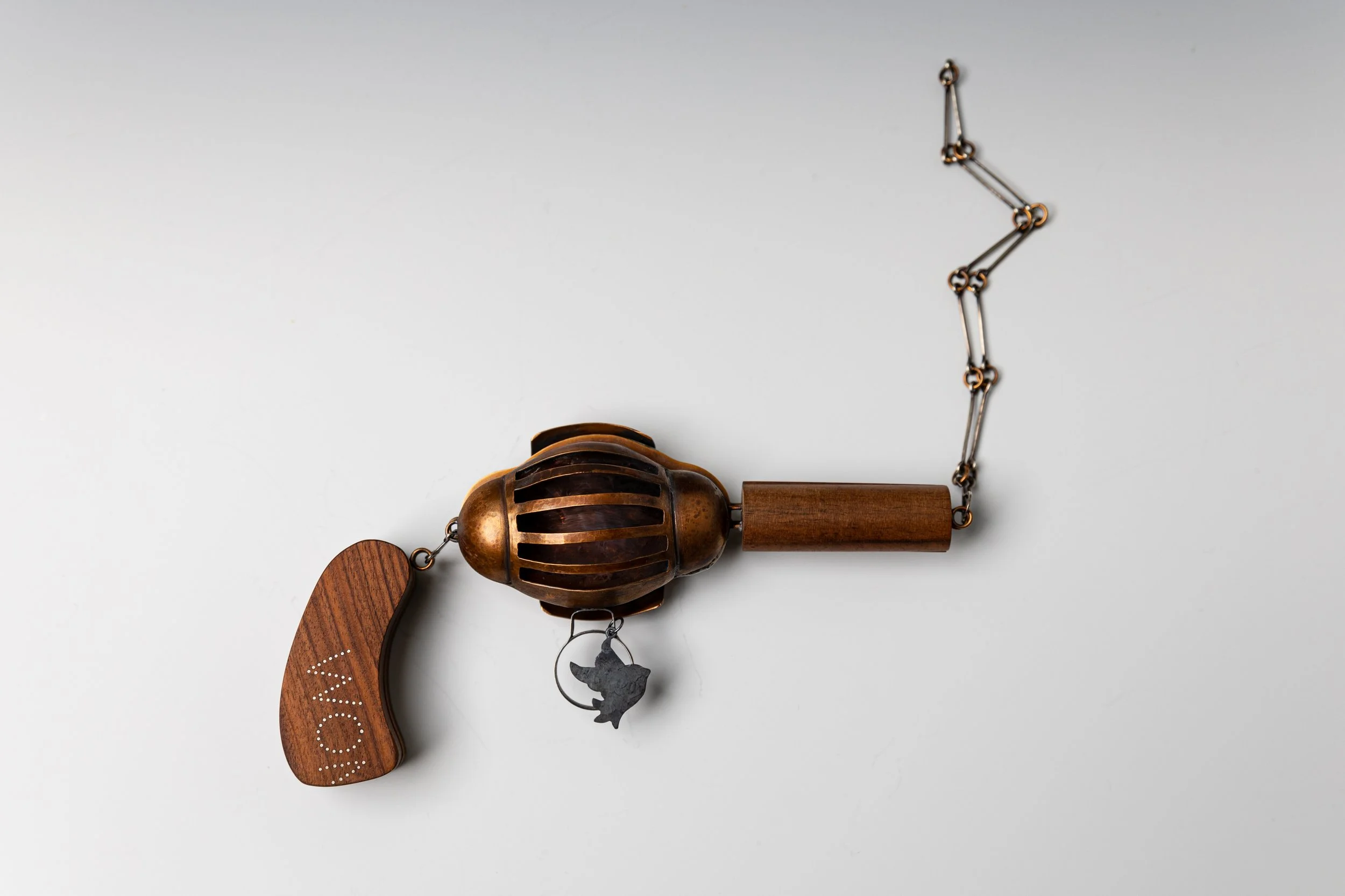 ""By transforming the gun, an object often associated with violence and dominance, into a piece of jewelry, I aim to provoke thought and dialogue about the transformative power of women. The gun shape serves as a metaphorical representation of the strength and impact women can have in reshaping societies and dismantling systems of oppression.