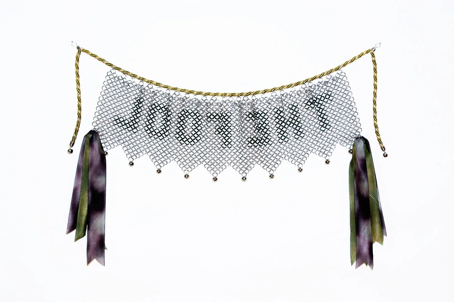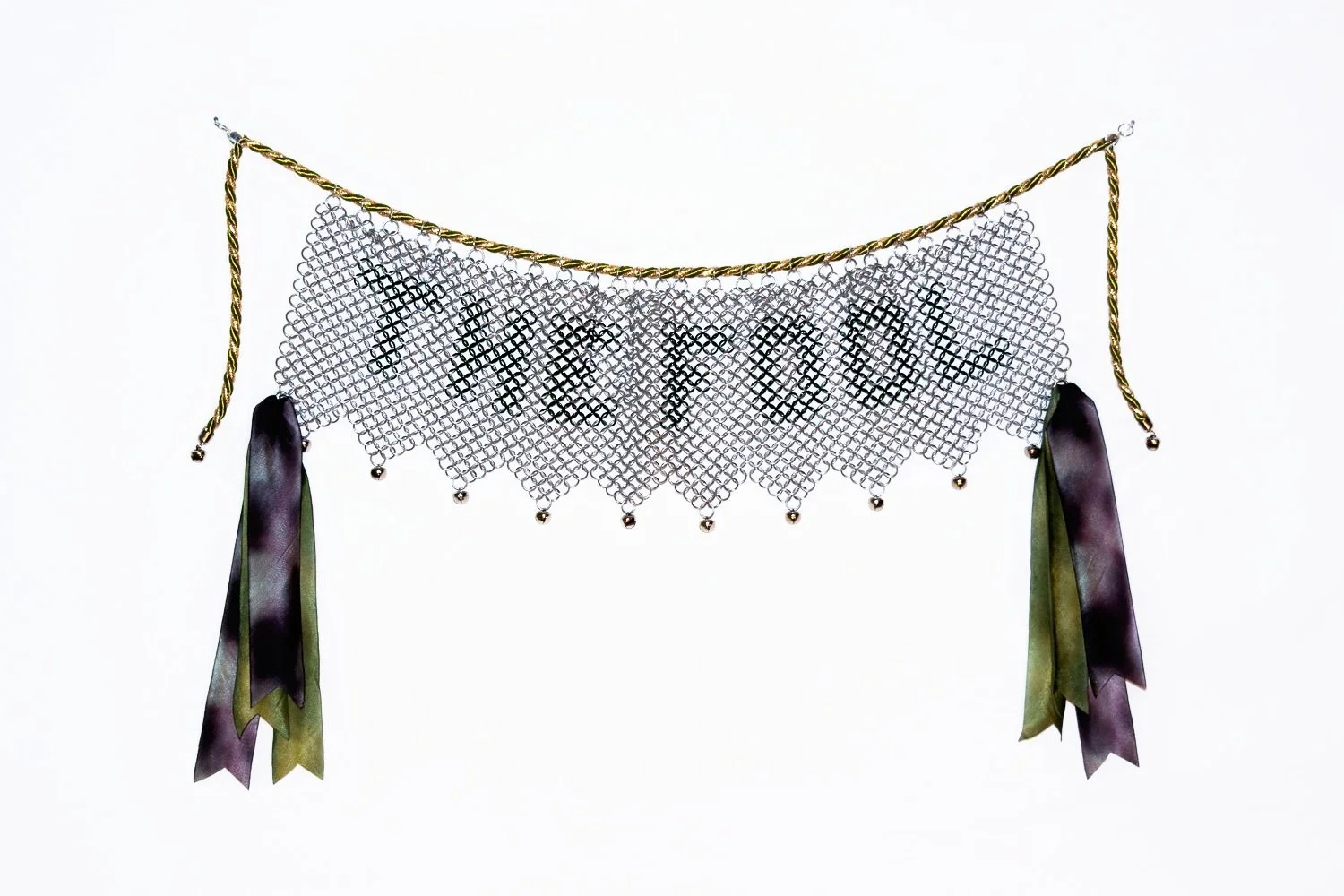 "The Banner of the Fool", Mixed media (chainmail, silk ribbon, bells, cord trim), 16.5" x 22" x 1", 2024