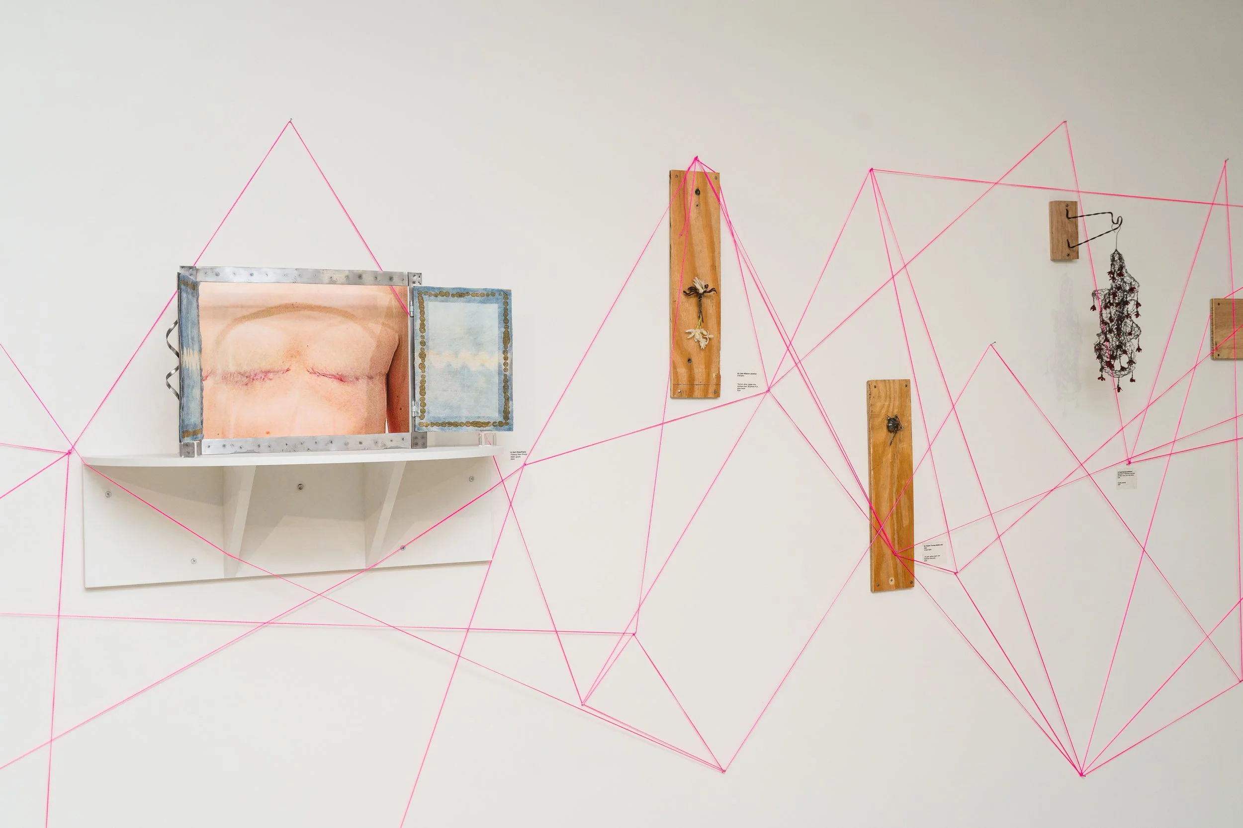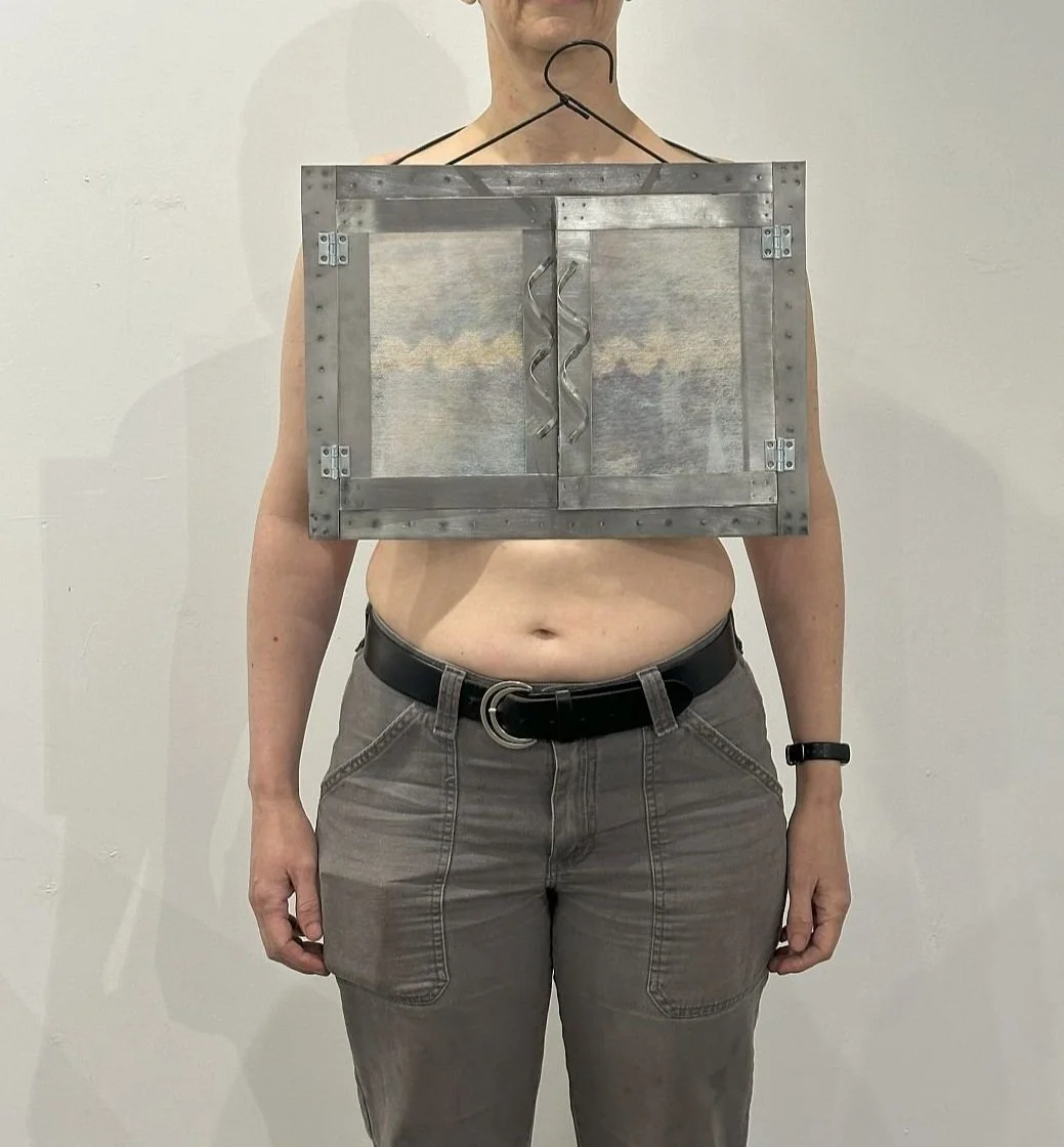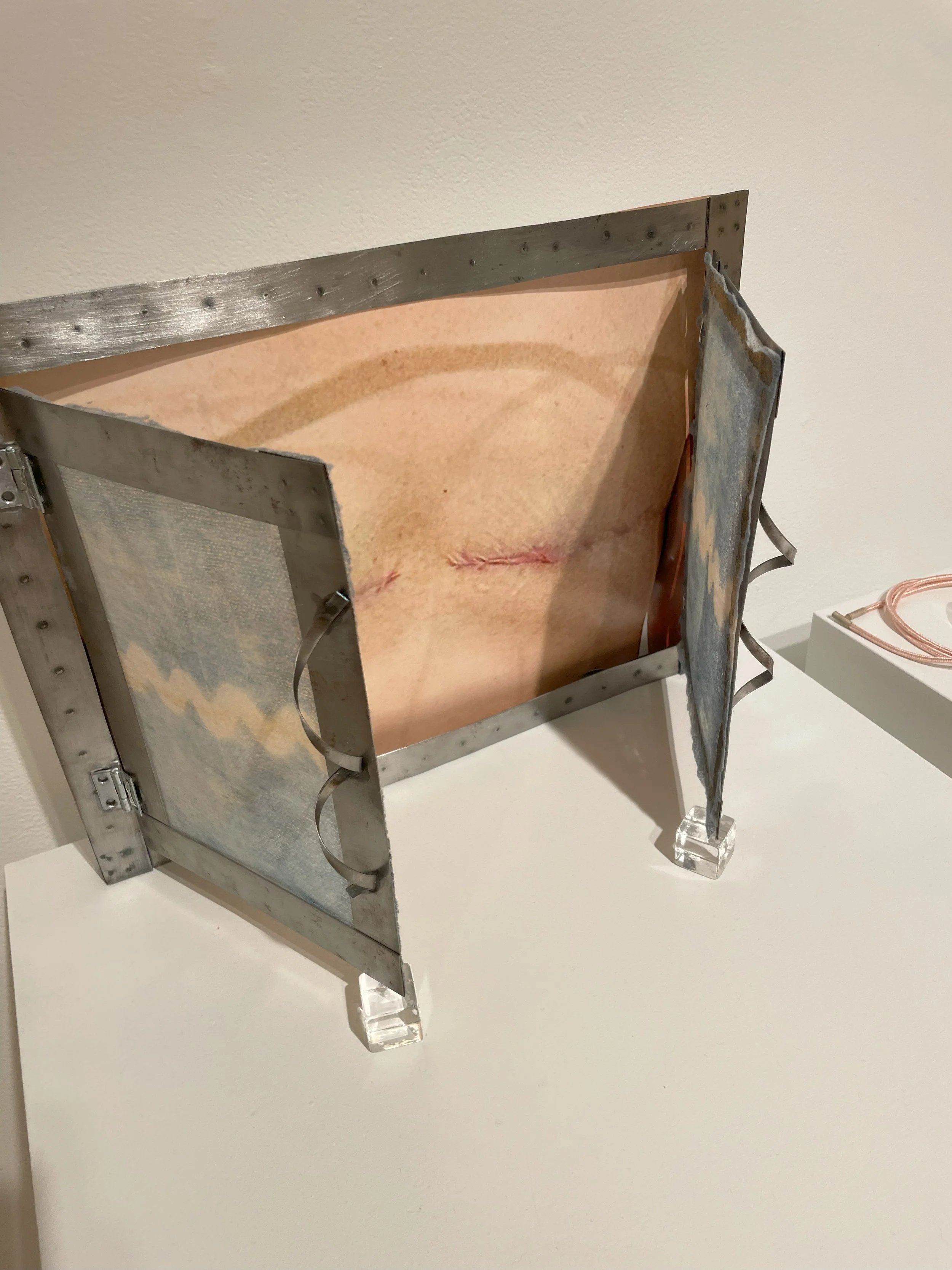 “Opening this window reveals a new identity. Steel is the skeleton that frames the transformation, juxtaposed with the delicate gauze that symbolizes protection and repair. The pattern of dents left by the spot welder and dots of glue to hold the gauze signify the careful research that provided the structural support. The sun’s rays were used to cyanotype the gauze with a wave pattern representing restorative energy and the blue color of the sky. Once open, the waves align with the scars that allow the body a new outlook on the world, to breathe more deeply with the lungs and heart closer to the surface.”