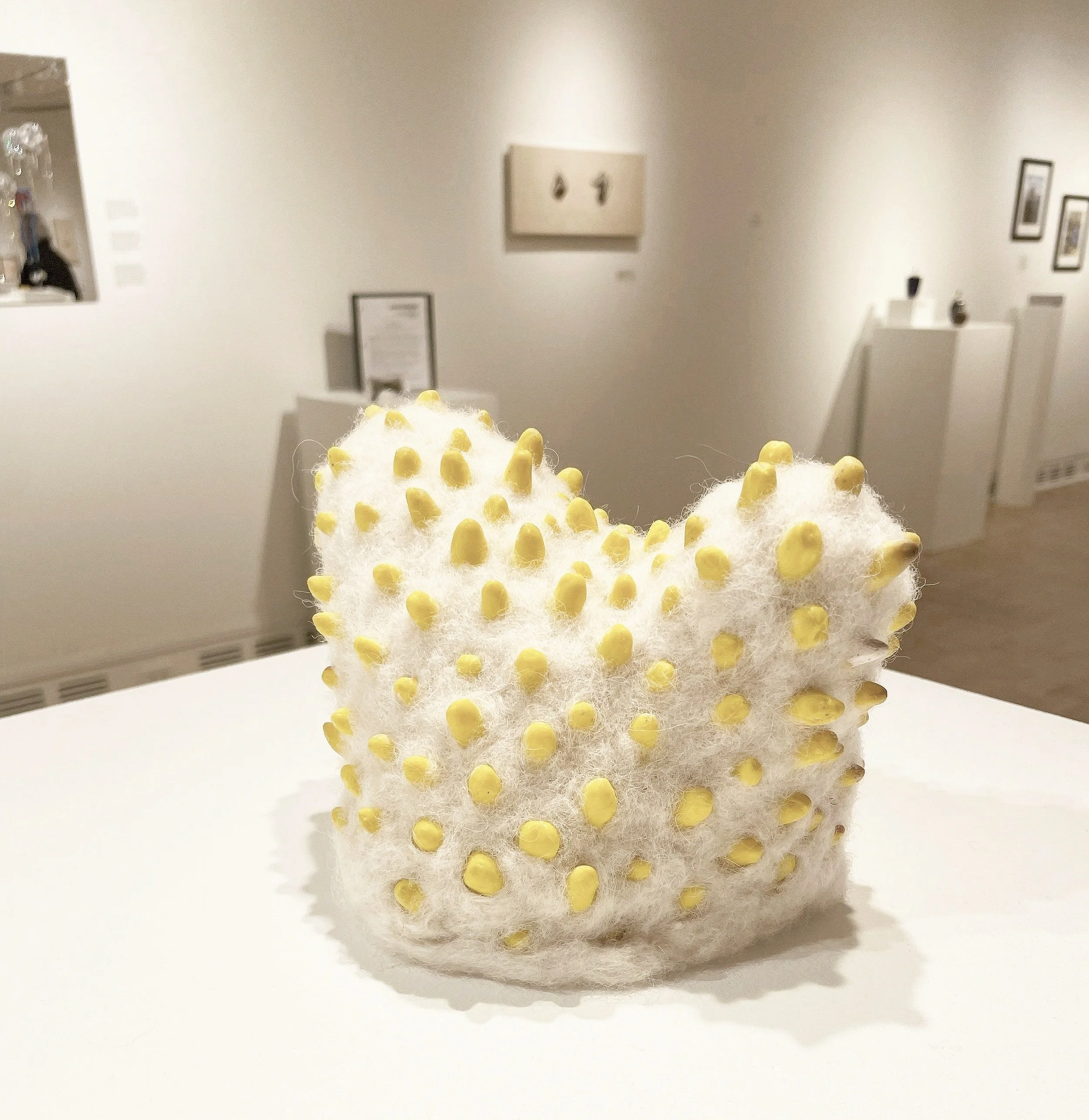 “Coat is concerned with the interactions between opaque media of different degrees of hardness. Wool batting is needle felted onto the glass casting. The glass body of the piece is made with offcuts of fusible sheet glass and results in a very plastic texture. The opaque body with a matte surface is in opposition to the classic associations of glass as smooth and transparent. The warmth and pliability of the wool also defies the material expectation of a glass object as cool and ungiving to the touch. The opacity of the glass lends the fiber a sense of translucency, the eye seeking the form beneath. The density of the wool hides all but the tips of the form, stirring curiosity about the object while also creating a sense of discomfort in the unknown.