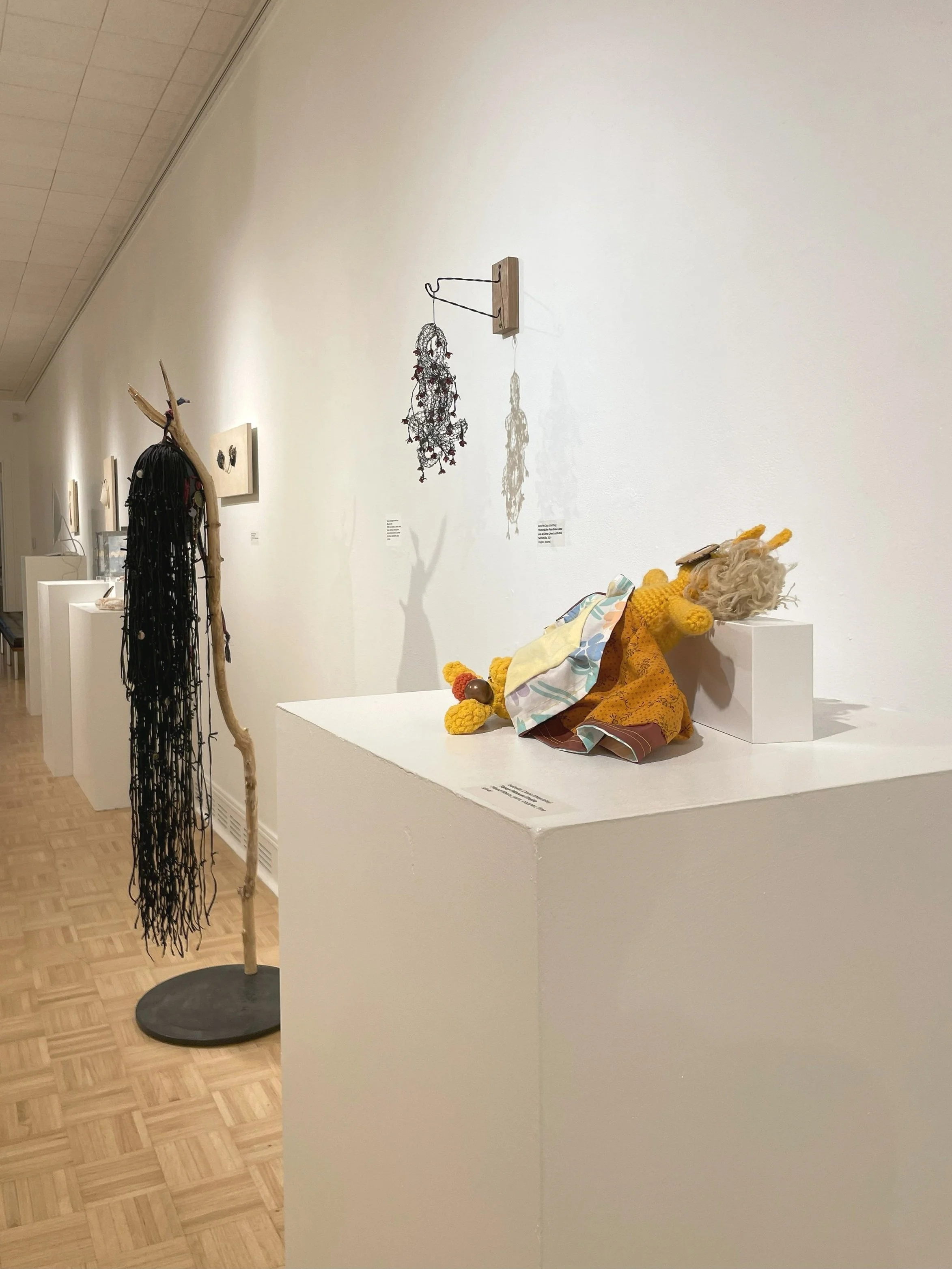 “My work focuses on the ever-continuing lineage of deconstructing racist Black stereotypes and recontextualizing them to understand how these stereotypes enabled the ongoing abuse and slaughter of Black people in America. Stereotypes such as Mammy or Jezebel warp ideas of womanhood and sexuality more specifically asexuality. As a black asexual person, I am often unseen or regarded as an impossibility. My existence directly contradicts the harmful caricatures forced on Black feminine individuals. I create objects such as topsy-turvy dolls and fiber/metal jewelry worn on the body to challenge existing bias further while celebrating Black femininity.”