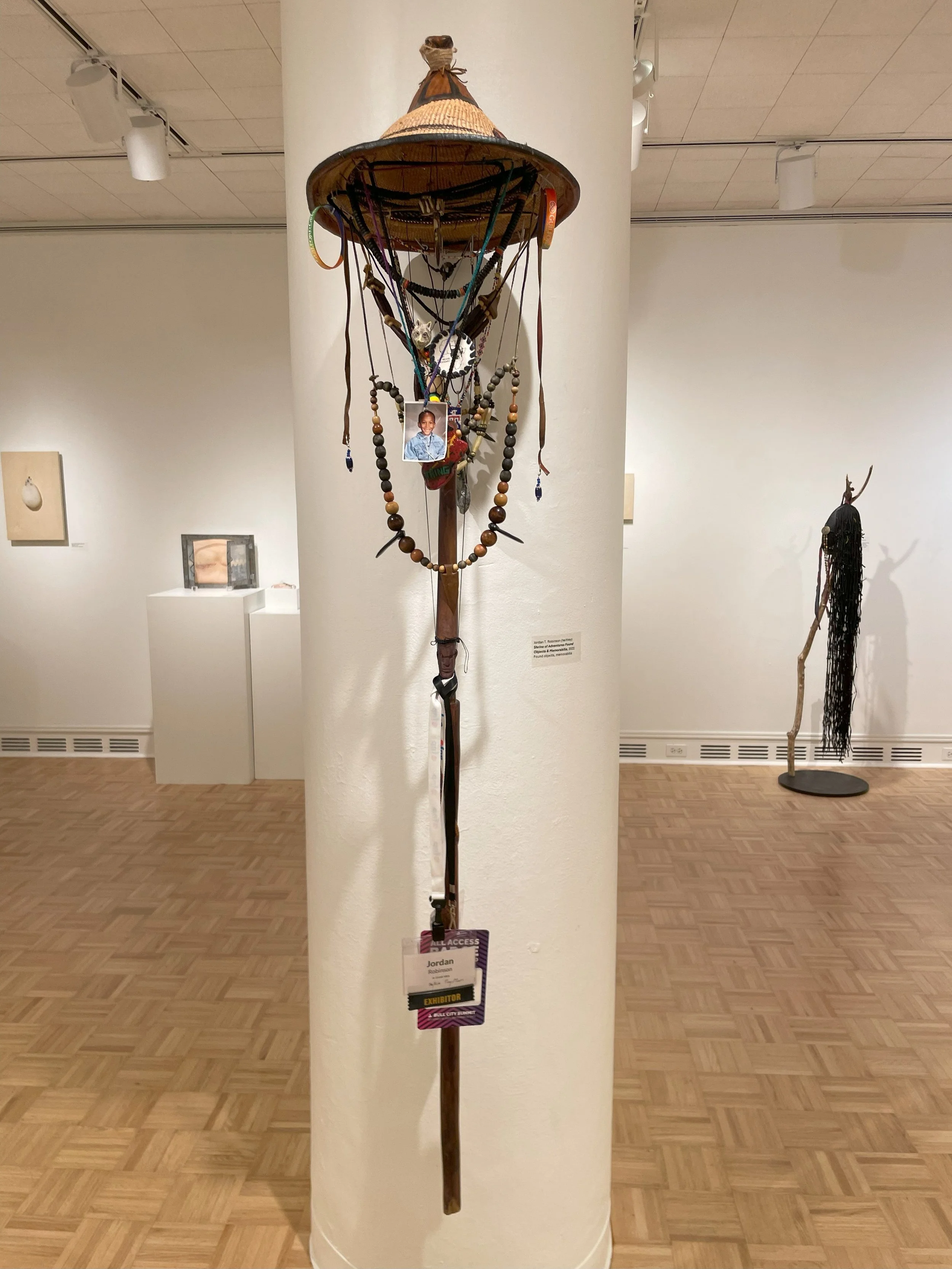 “The shrine of adventures is made up of found objects from my personal collection of memorabilia that I've held on to for the past 15 years. These are items that have stopped people to talk to me and get to learn about that or me while I go on my journeys. Whether it was camping or traveling or going to an event or going to some place the necklaces and jewelry and staff and especially the hat has always caught the attention of strangers which then became friends by the time we split ways.