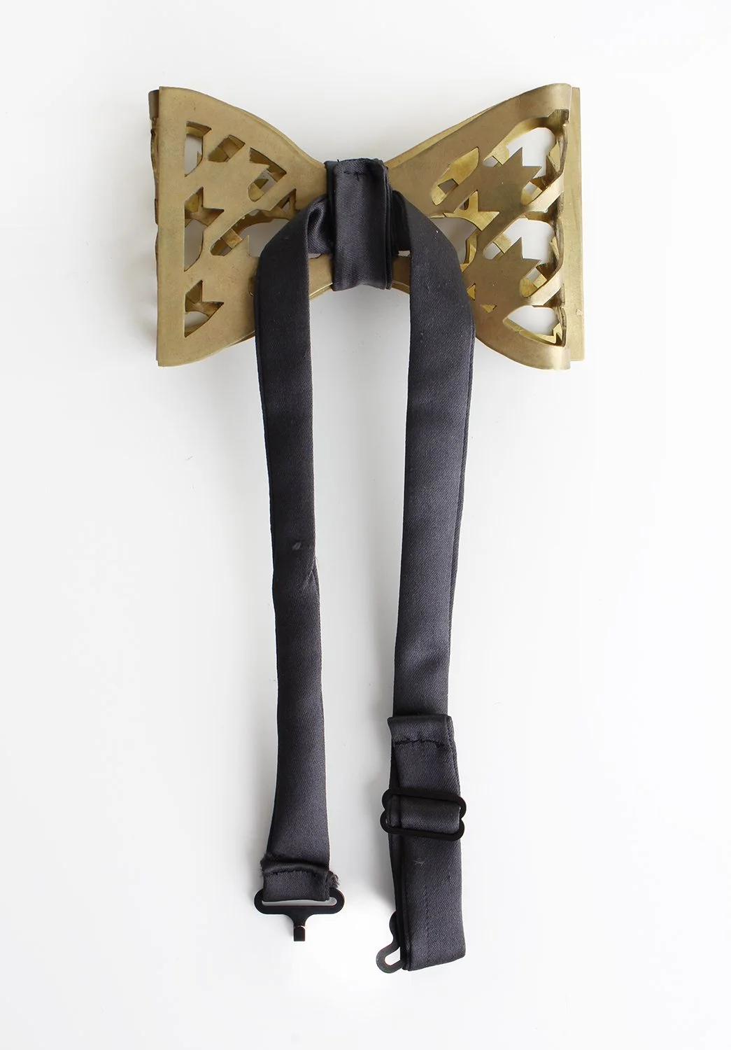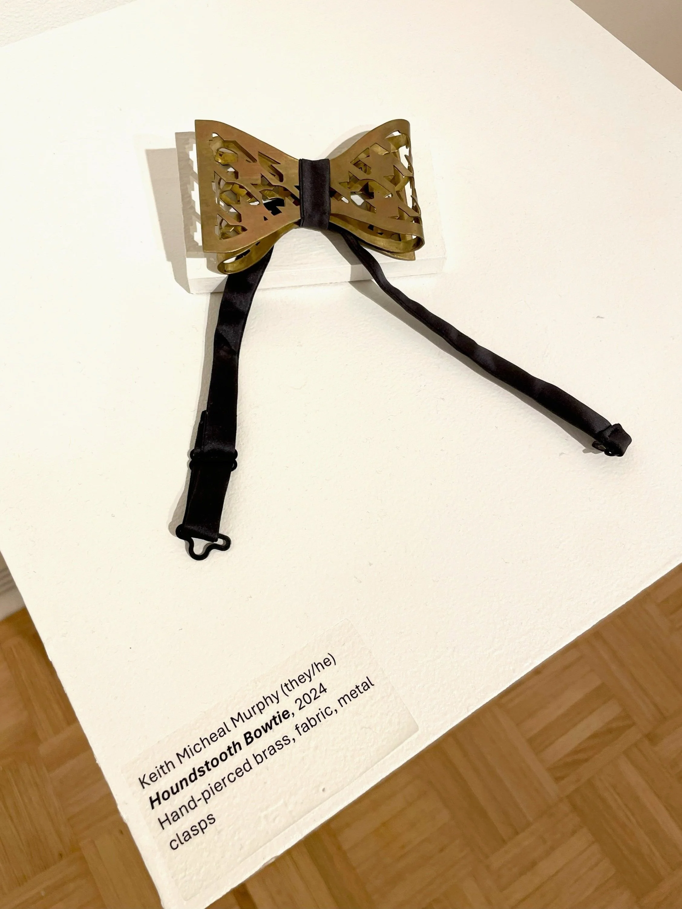 "Houndstooth Bowtie", Hand-pierced brass, fabric, metal clasps, 4" x 2.5" x 1", 2024
