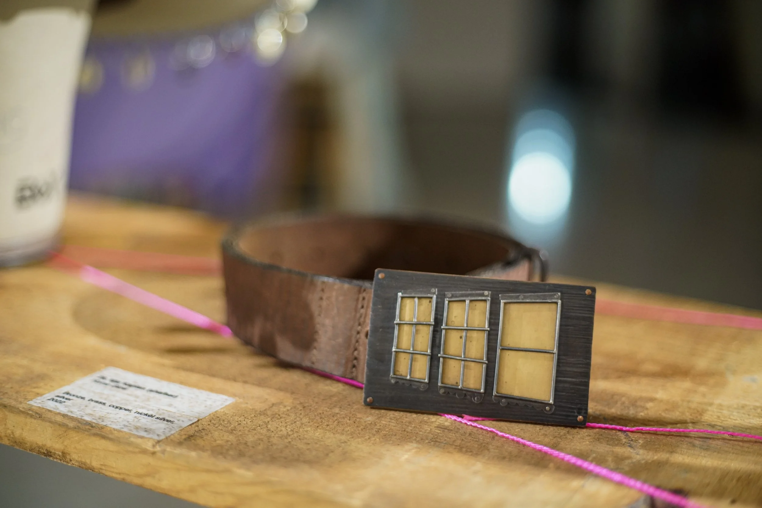“This piece is my connection to a place. It is a home in Penland, North Carolina that I lived in for two years. The front windows of the house are fabricated from wire, and they frame a sheet of bronze patinated in a gold and warm tone. The exterior of the house is textured copper, with horizontal stripes that emulate wood paneling. I blackened the materials that make up the house to show that it is night time. This piece recalls all the times I came home in the evening and was welcomed by the warm glow of light emanating from inside. I wanted to memorialize and treasure the safety and comfort that I felt while in this home. When you turn the piece over, you then see the inside of the house; a single light bulb hangs surrounded by moths. I feel a deep sense of connection to this house and the memories I made there. Although I am replicating a specific place, the house is rendered generically enough that anyone can relate. Transforming it into a functional belt buckle was my way of treasuring it. Being able to wear it also allows me an additional layer of connection to this work."