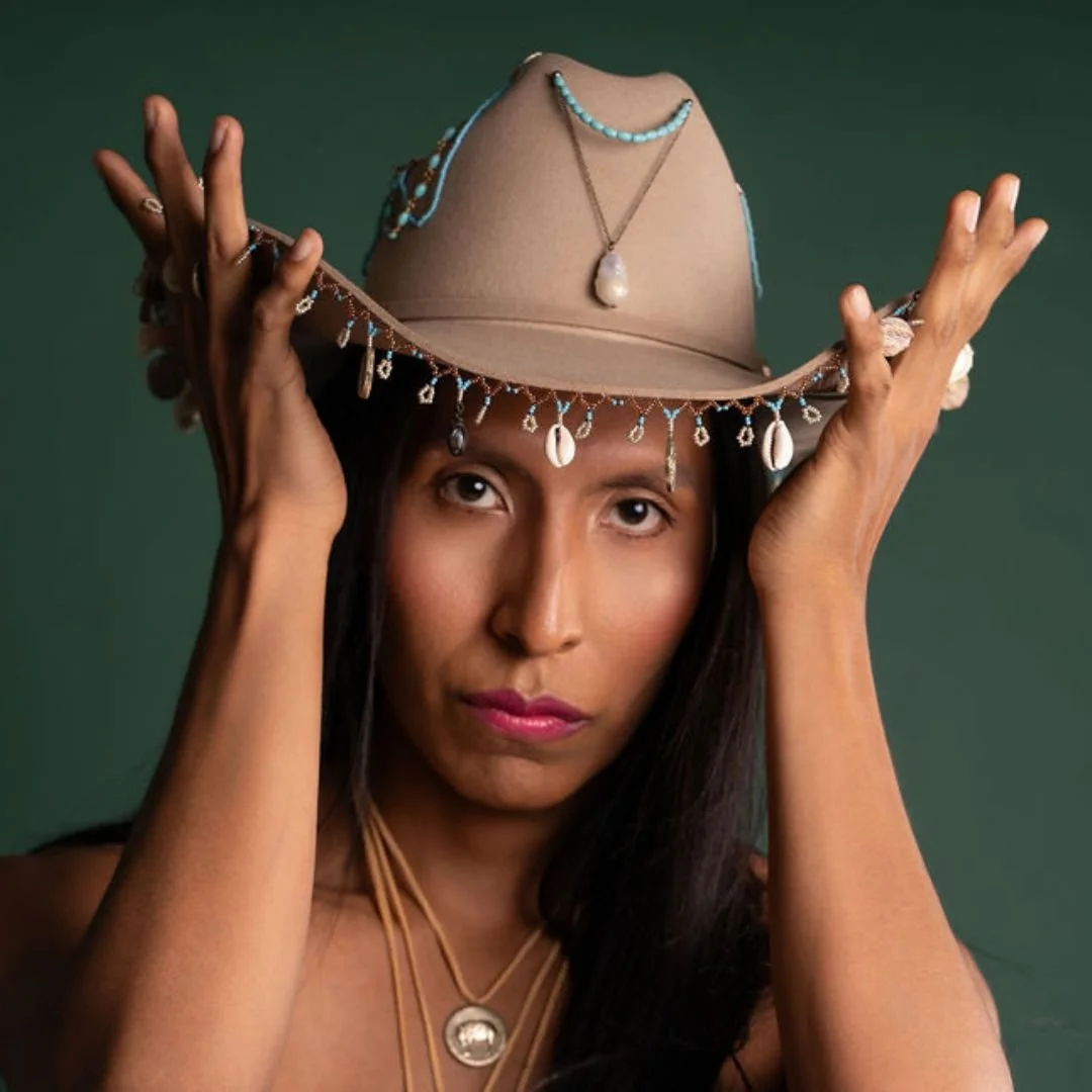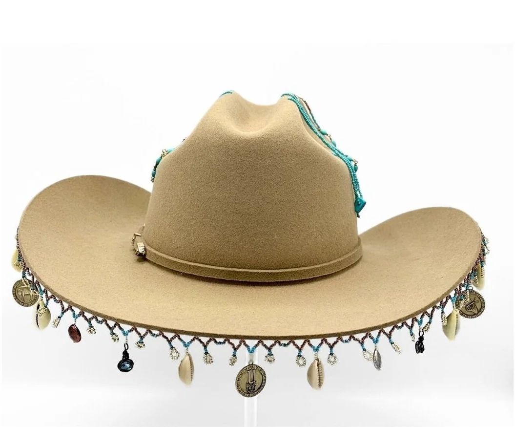 “It started with storytelling; Omar and Taylor shared their ancestral stories about the relationships between Indigenous people and the fauna important to them. For example, the Monarch butterfly and the Puma are both migratory creatures unaffected by man-made borders. Deer and rabbits are vital beings to the survival, lifestyle, and storytelling of Paiute people. Their shared respect and care for animals and stories led to this collaboration. From the hat hang six brass coins, each one representing Omar and Taylor’s heritage, while the other side shows their combined brand logos. The hat was then hand-embellished by Taylor with shells, pearls, glass beads and each of the artist's birthstones - all enhancing the theme of connection. After starting this project, both artists became aware that their languages are in the same language family.