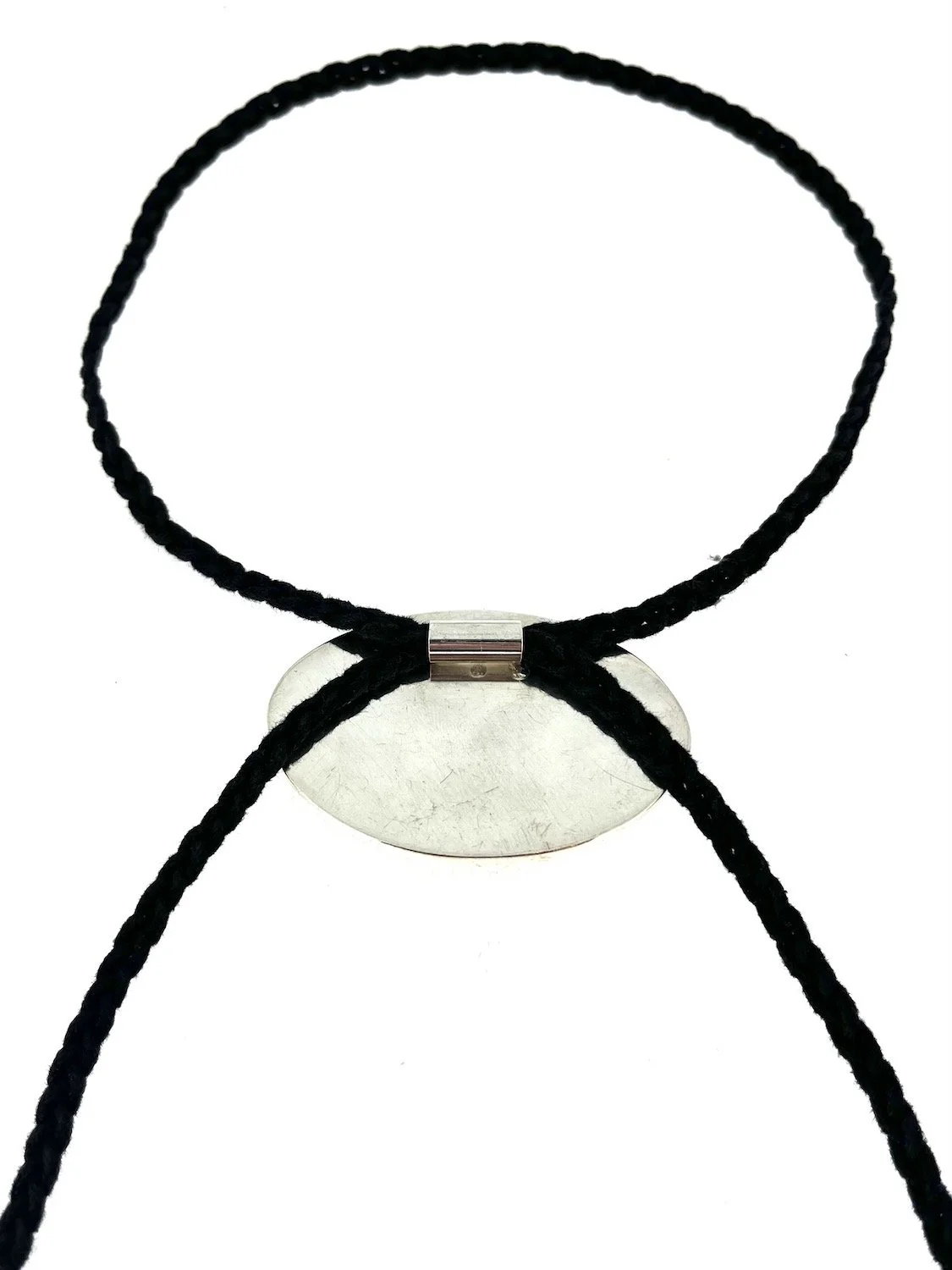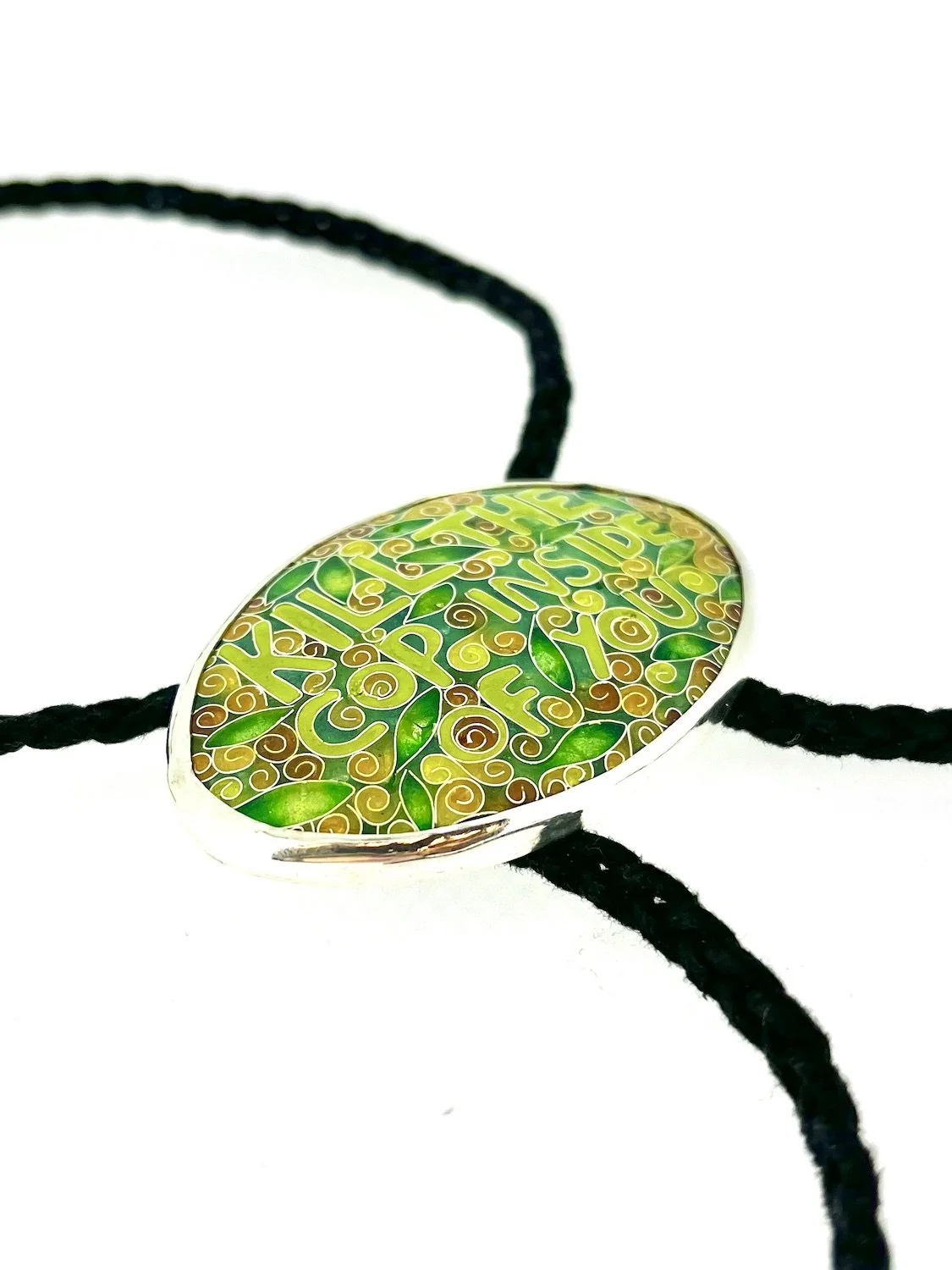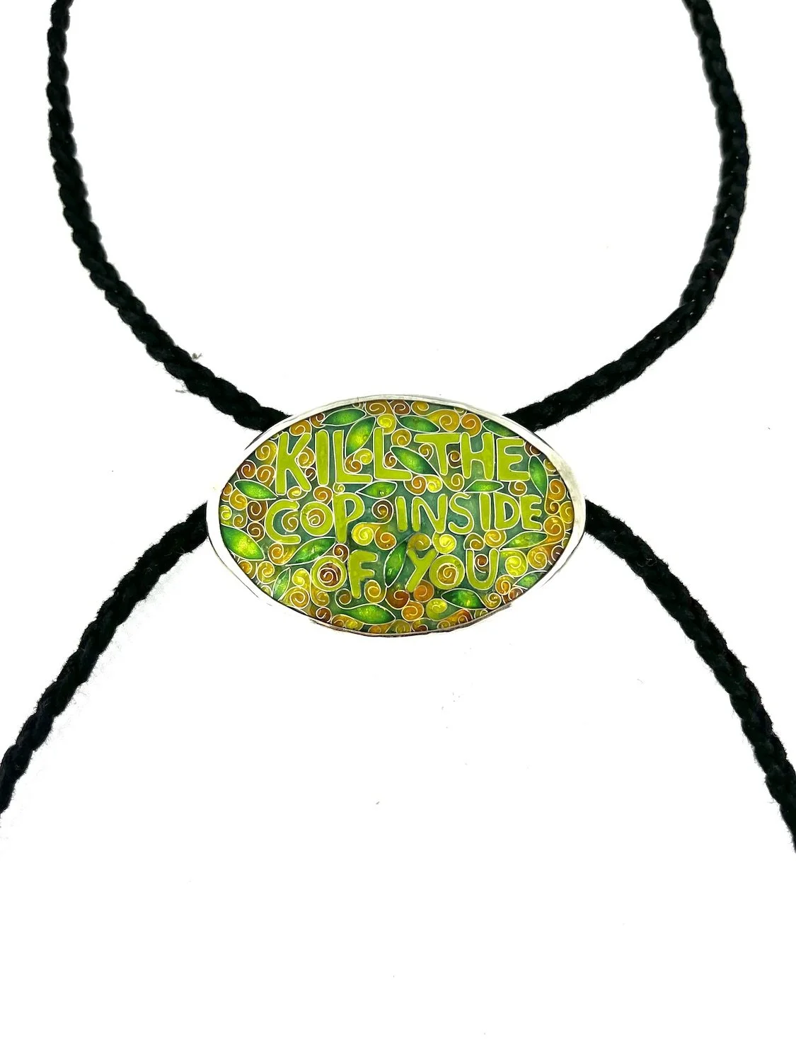 “This bolo is both note-to-self and in-your-face, a meditation and a proclamation. When I wear it, I witness the viewer go through waves of reactions as they lean in to make out the low-contrast letters. First: shiny, vibrant, pretty! Then: “kill.” A sense of violence overcomes them, familiar and sickening at once. “Kill the cop.” This can offend some, often leading to an immediate confrontation, or at least a quiet reckoning. Finally: “inside of you.” A tender reflection, a sharp turn in focus. With each person I witness along this arc, I must reconsider my own relationship to violence.”
