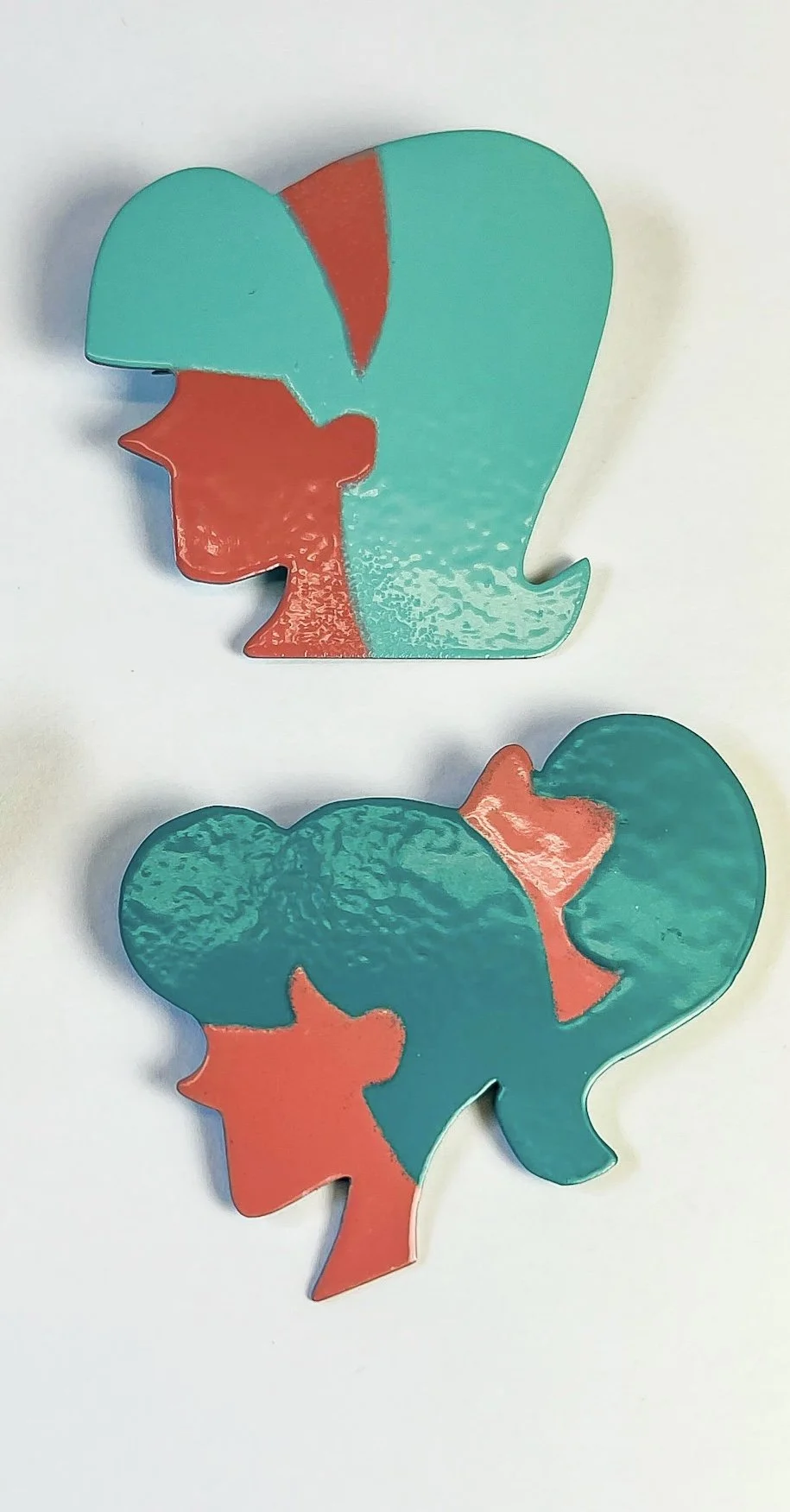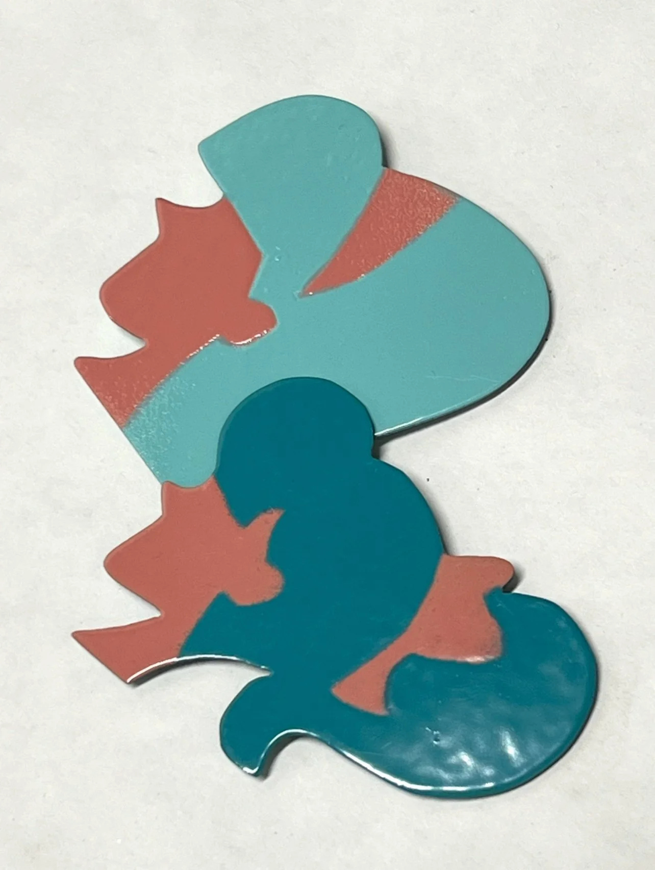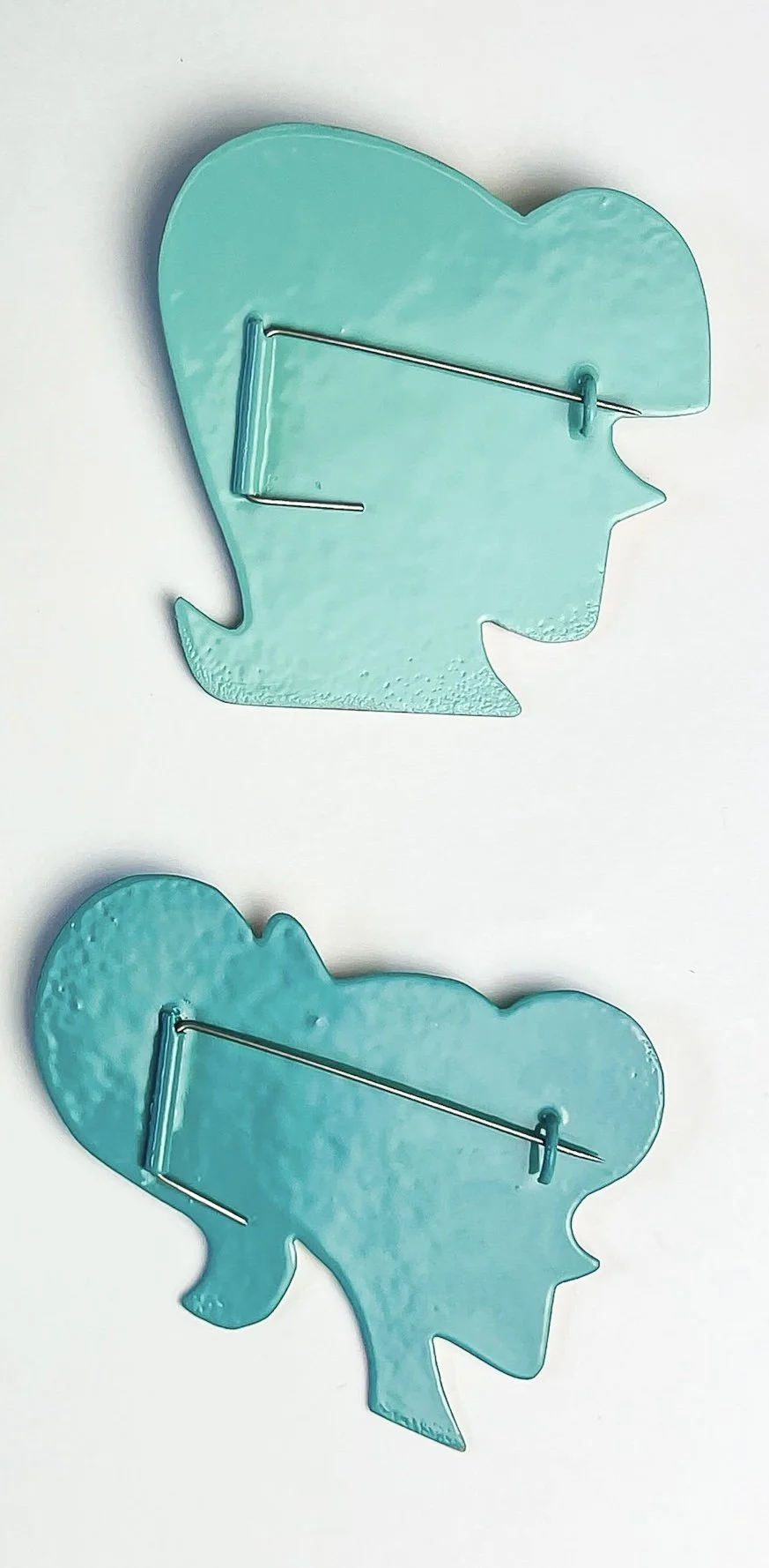 “This was my breakthrough moment of learning to powder coat my jewelry. I had spent the week learning various techniques in powder coat and fell in love with using stencils. These were created using hand cut templates and sifting on the powder in many layers.”